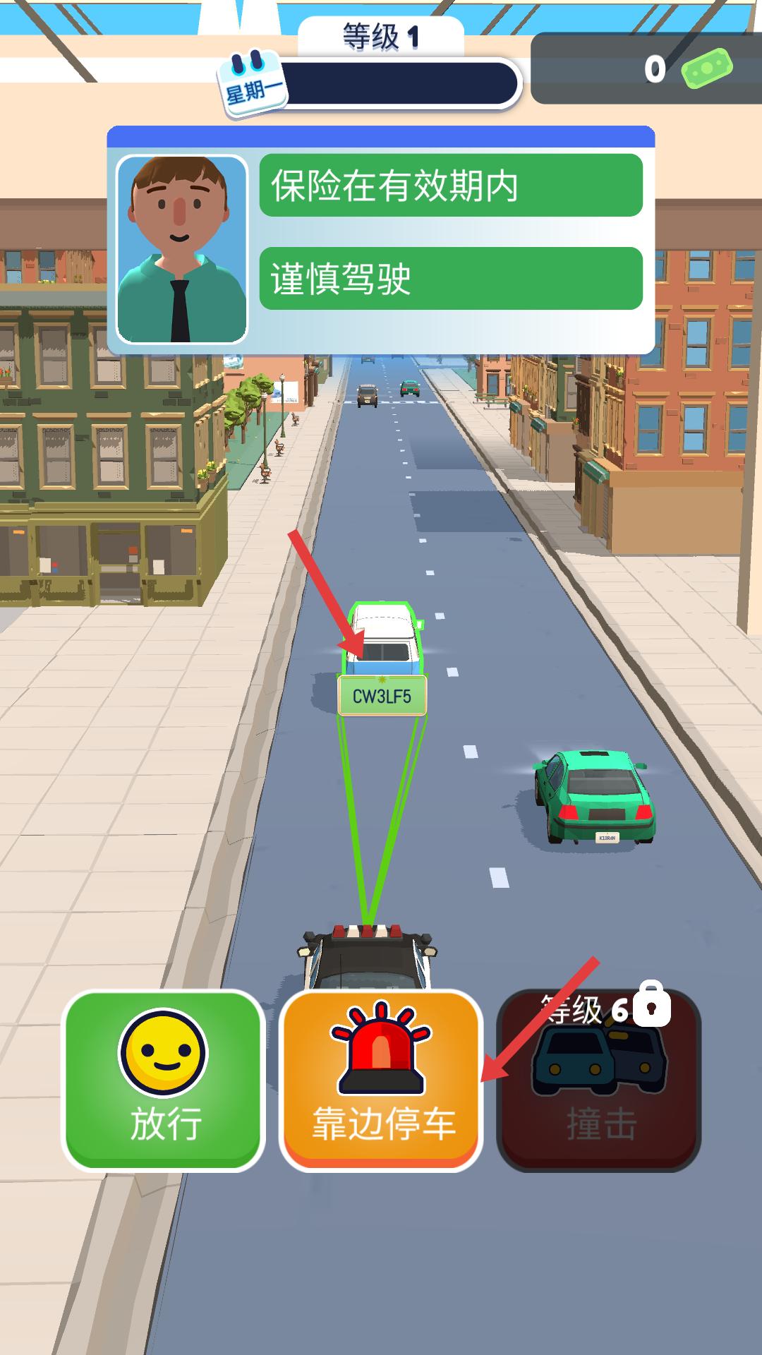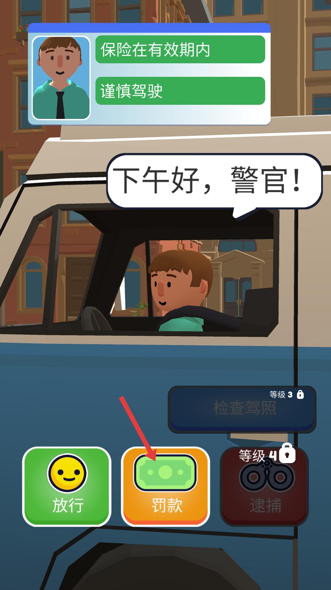 4、遇到保險在有效期內且謹慎駕駛的車輛,若需處罰可點擊罰款按鈕,以此規范交通行為,同時積累執法資源,提升游戲進程。