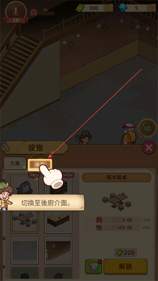 2、玩家通過設施界面,花費資源解鎖和升級店內設施如餐桌、后廚設備,提升店鋪的運營效率和顧客滿意度。