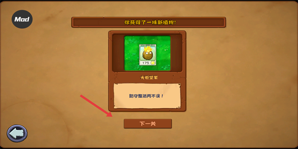 4、成功抵御所有僵尸后,獲得新植物獎勵,點擊下一關,繼續挑戰新的冒險關卡。