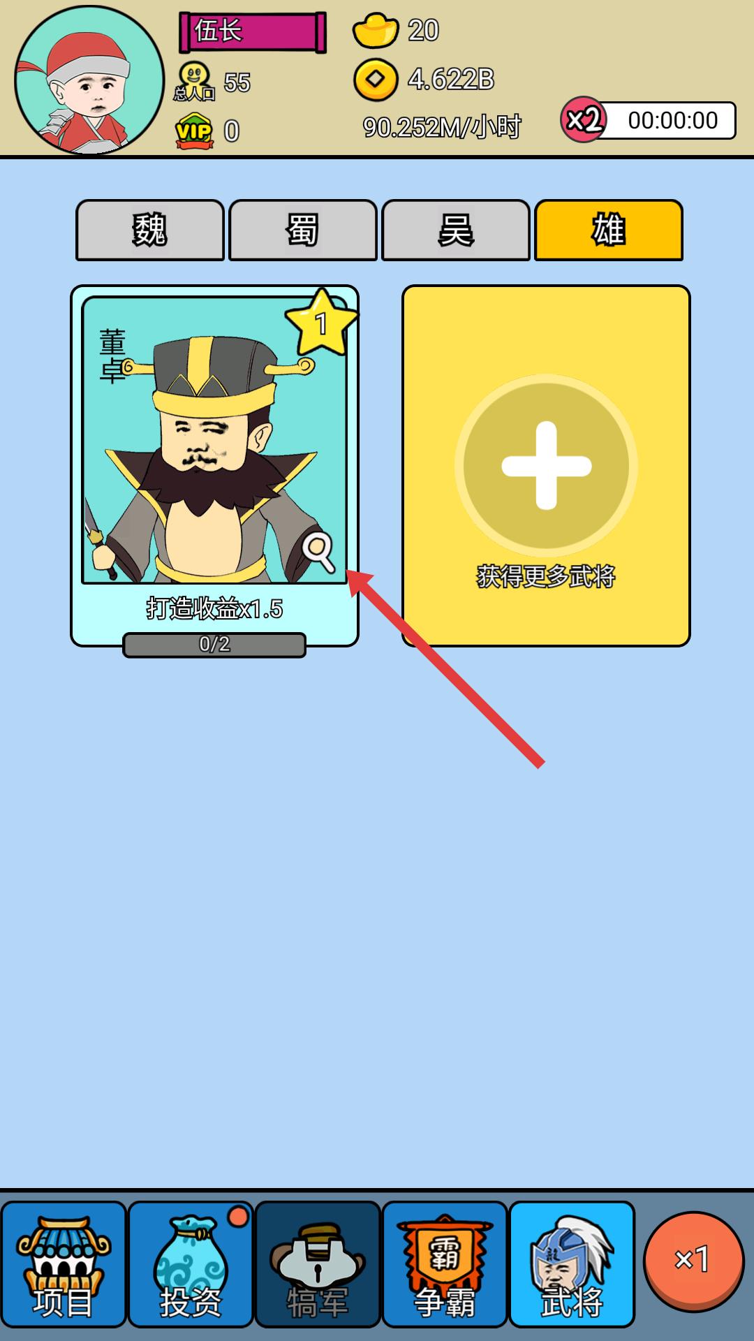 3、點擊武將卡片上的放大鏡,可查看武將詳細信息,了解其屬性與技能,便于合理搭配武將陣容,優化戰力與產業收益。