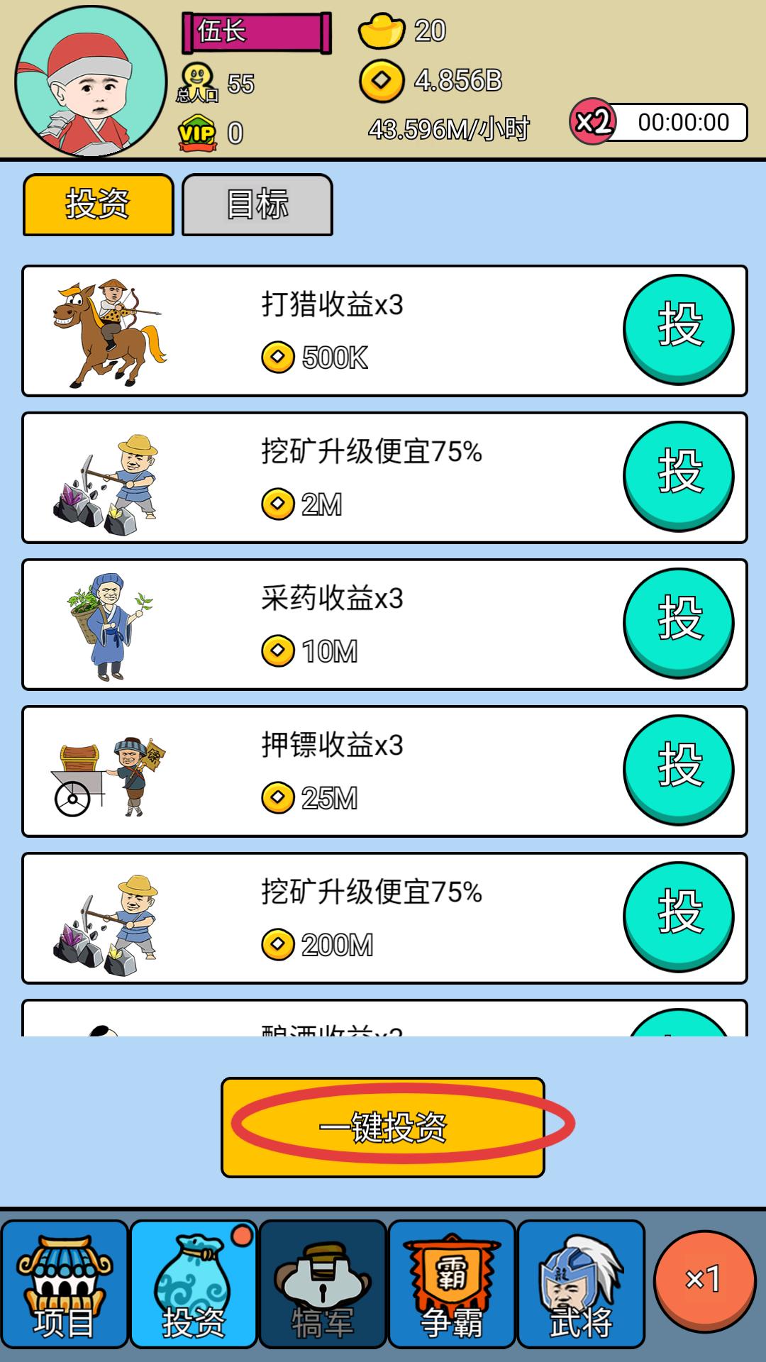 2、在投資界面點擊一鍵投資,可快速對打獵、挖礦等產業進行投資,提升各產業收益,高效利用資源,推動整體發展進程。