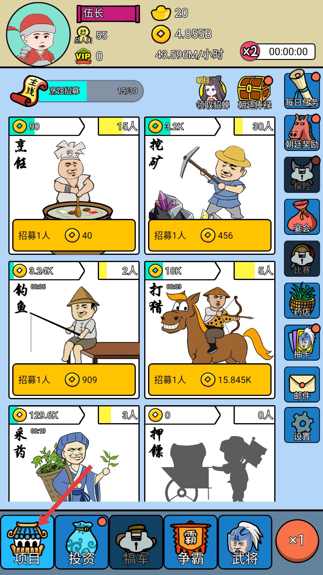 1、點擊項目按鈕,可進入項目界面,合理分配資源,提升各產業人力與收益。