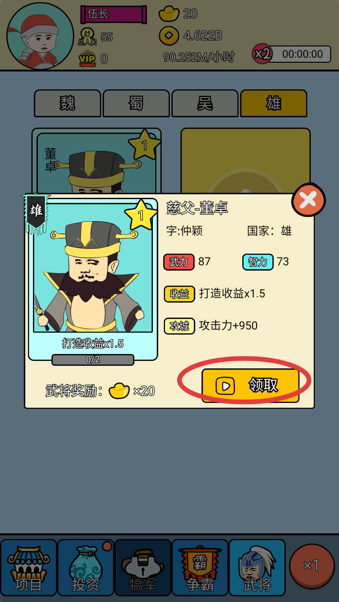 4、獲得武將董卓后,點擊領取按鈕,可讓其生效,提升打造收益與攻城攻擊力,助力產業發展與攻城略地,積累資源與戰力。
