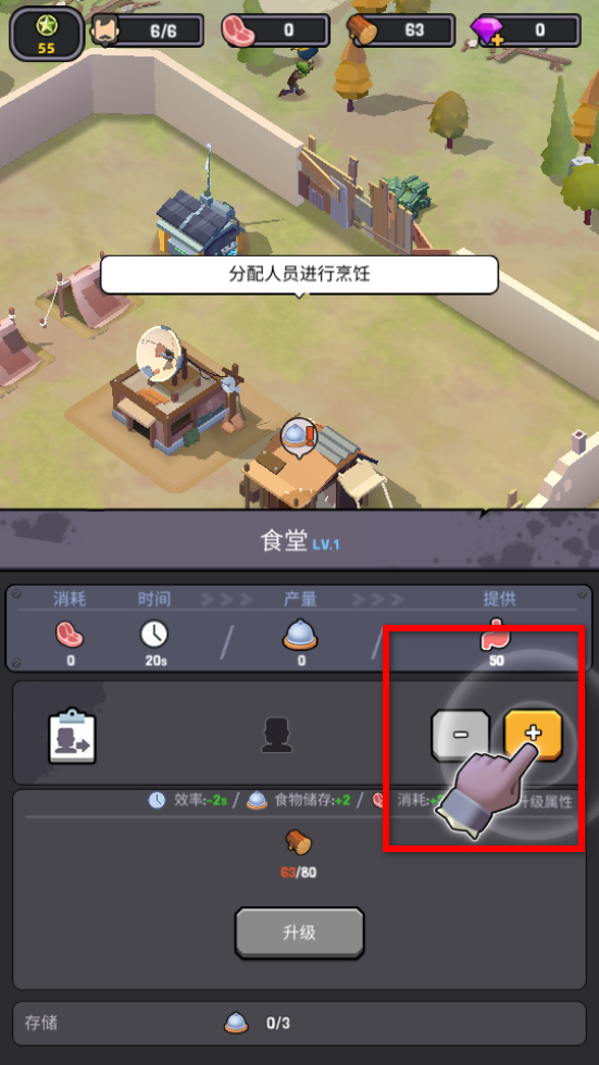 3、食堂建成后,點擊加號按鈕分配人員進行烹飪,讓食堂有效運作,為營地人員提供食物保障。