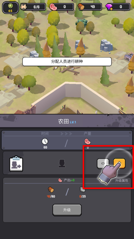 4、建造農田后,點擊加號按鈕分配人員進行耕種,通過耕種持續獲取食材,助力營地食物穩定供應。