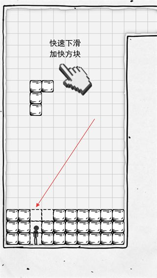 3、快速下滑方塊可加快其下落速度,在合適的時機加速方塊下落,精準地壓扁下方的火柴人,完成關卡目標。