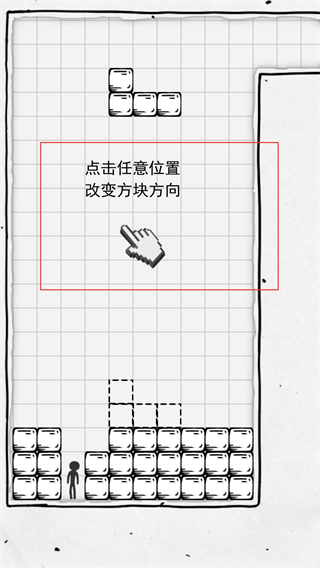 1、點擊任意位置可改變上方方塊的方向,根據下方火柴人的位置和方塊的布局,調整方塊方向以適配下方的空格區域。