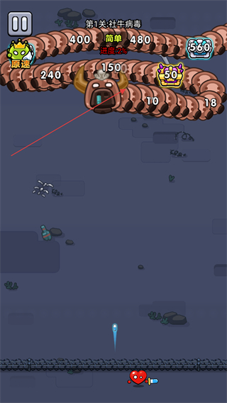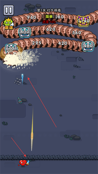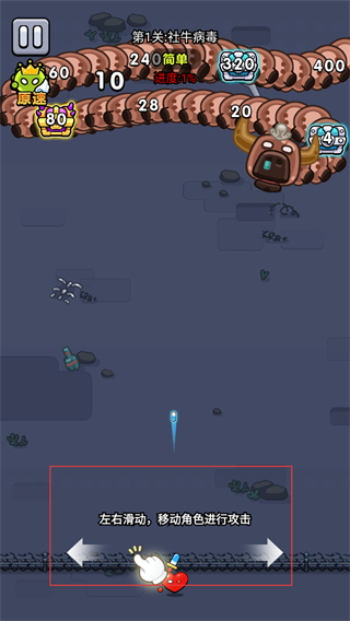 2、玩家操控左右滑動屏幕控制細胞角色移動,發射藥丸攻擊上方的病毒和細菌,精準打擊目標以清除威脅。