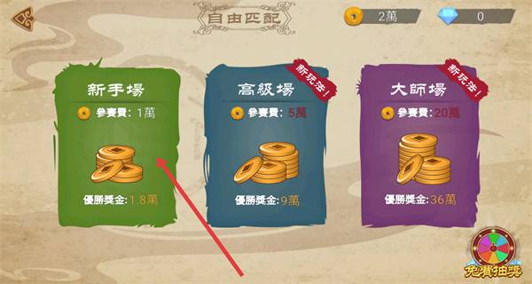 2、選擇自由匹配模式進入場次界面,對比新手高級大師場的參賽費與獎金,根據金幣儲備規劃參賽方向優先嘗試低門檻場次。