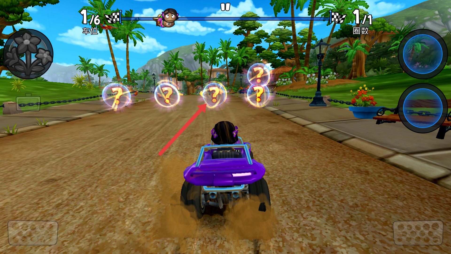 3、在賽道上遇到帶有問號的道具球時,駕駛賽車撞擊它們,可獲得隨機道具,助力你在比賽中取得優勢。