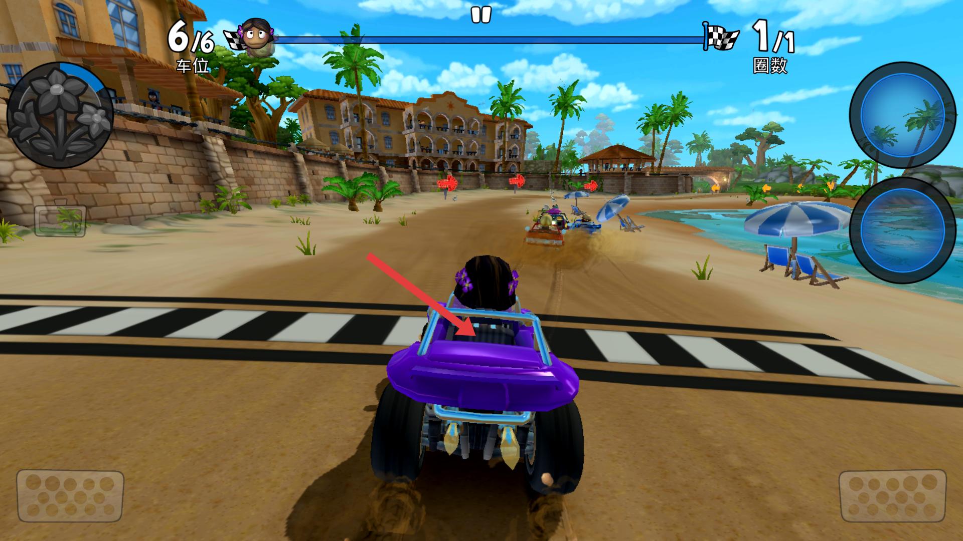 2、進入賽車比賽后,操控賽車在沙灘賽道上行駛,注意觀察車位和圈數,全力向前沖刺,爭取領先。