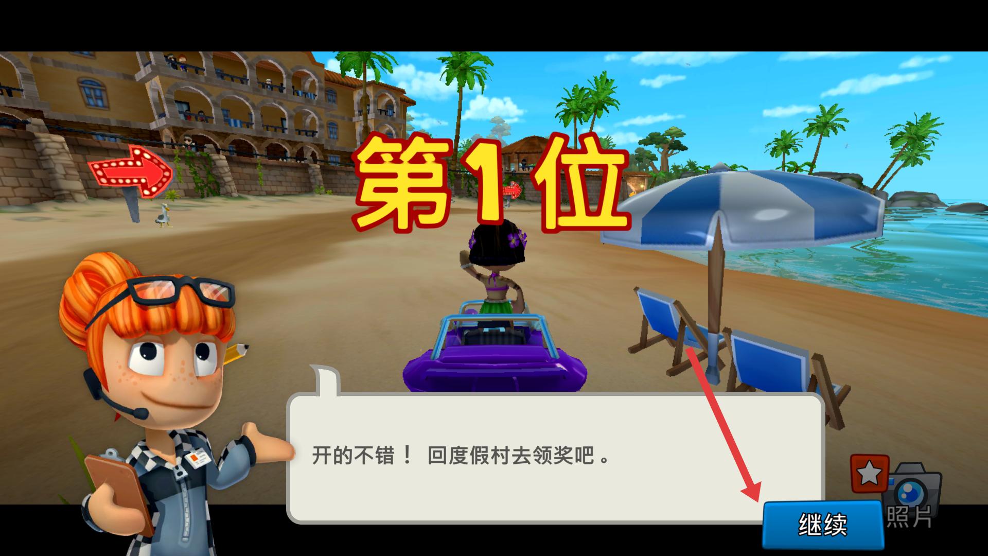 4、當比賽獲得第1位的好成績后,點擊繼續按鈕,即可返回度假村領取獎勵,繼續你的游戲進程。
