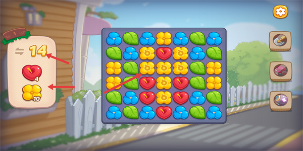 2、在消除界面,觀察花朵愛心等元素布局,交換相鄰元素,湊成三個及以上相同元素進行消除,逐步推進關卡目標。
