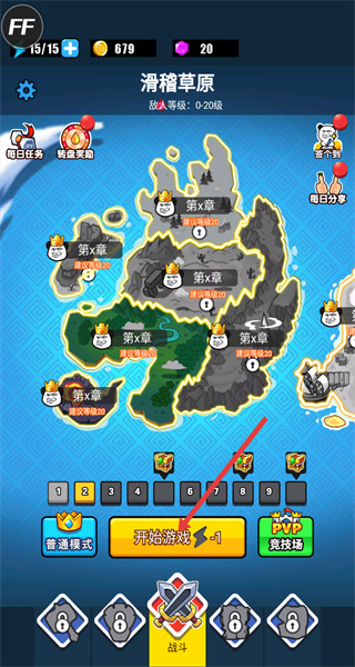 1、首先點擊開始游戲,進入戰斗關卡,此時可見地圖上的關卡區域,準備開啟戰斗挑戰。