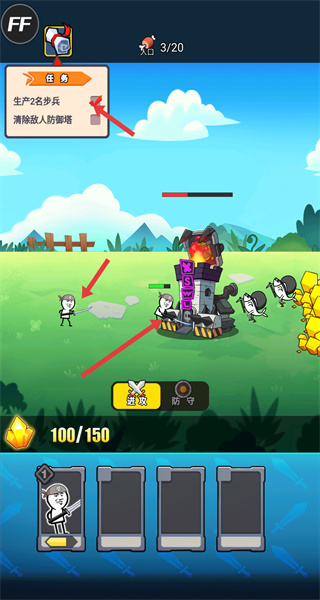 3、然后指揮步兵進攻敵人的防御塔,同時關注任務進度,確保完成生產步兵和清除防御塔的任務目標。