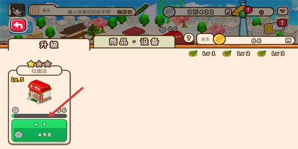 3、在升級界面,選擇拉面店進行升級,消耗貨幣提升其等級,增強店鋪的吸引力與收益。