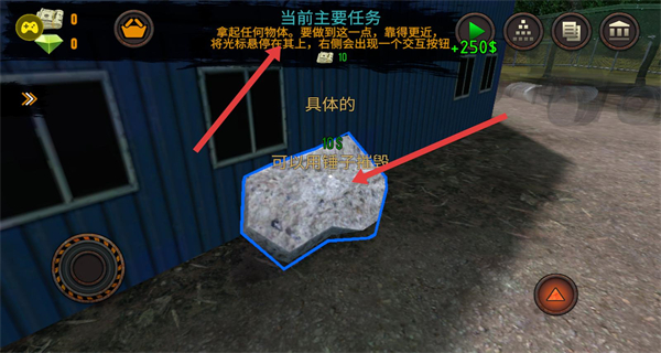2、接拿起物體任務靠近石頭,等右側出交互按鈕按提示操作拾取,遇到用錘子摧毀裝備錘子,需要找場景里的工具對準石頭攻擊完成獲金幣。