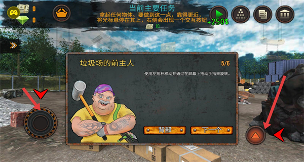 1、主界面選開始游戲進入廢品場,先看選項調畫質音效確保體驗流暢,遇不懂的點利用任務引導,跟著紅箭頭找交互物體熟悉操作。