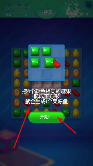 2、在界面看到提示,把4個顏色相同的糖果配成正方形,就會生成果凍魚,點擊開始按鈕,即可正式進入消除操作環節。