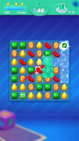 4、持續消除糖果后,界面會出現綠色小熊形象,這是關卡目標物品,成功出現小熊后,可繼續消除來完成關卡,提升通關評價。