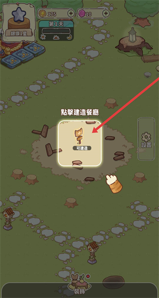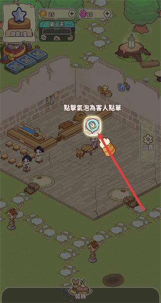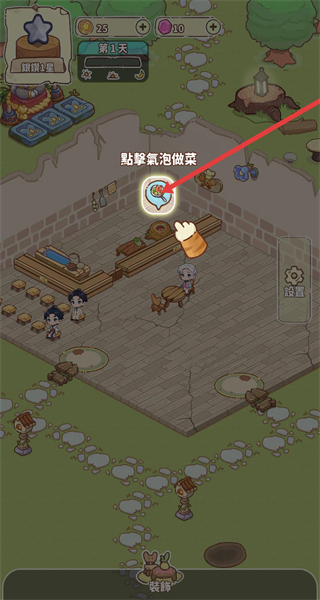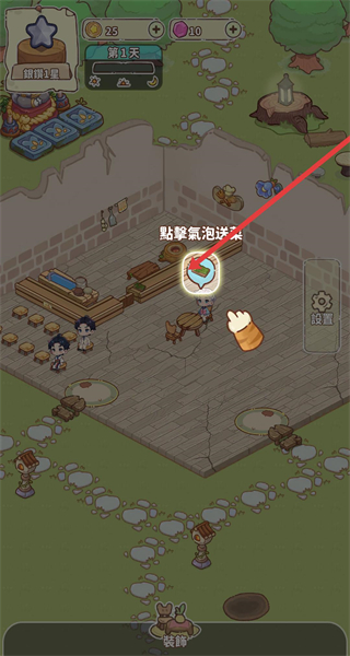 1、玩家需要點擊咕咪建造貨攤完成設施搭建,通過解鎖新經營區域建完后返回餐廳即可開始經營。