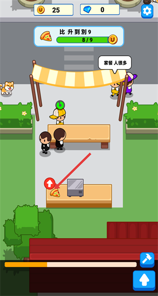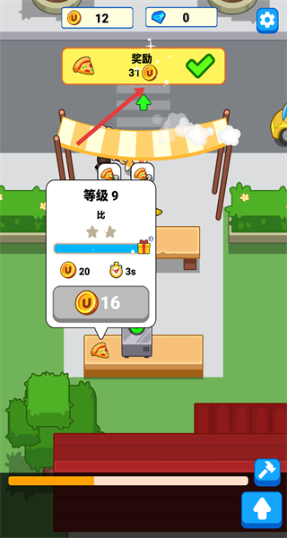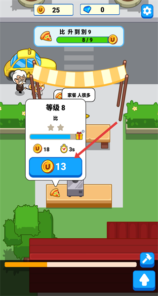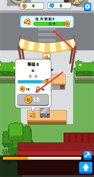 1、進入游戲后,關注等級進度與升級提示,點擊對應金幣按鈕,為餐點制作設備升級做準備。