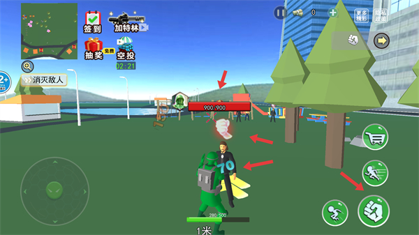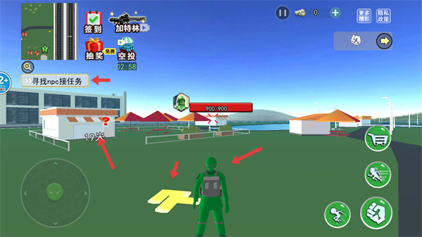 1、游戲中需尋找NPC接任務根據提示前往帶有問號的建筑附近,與NPC交互領取任務同時可參與簽到抽獎領取空投等活動獲取獎勵。