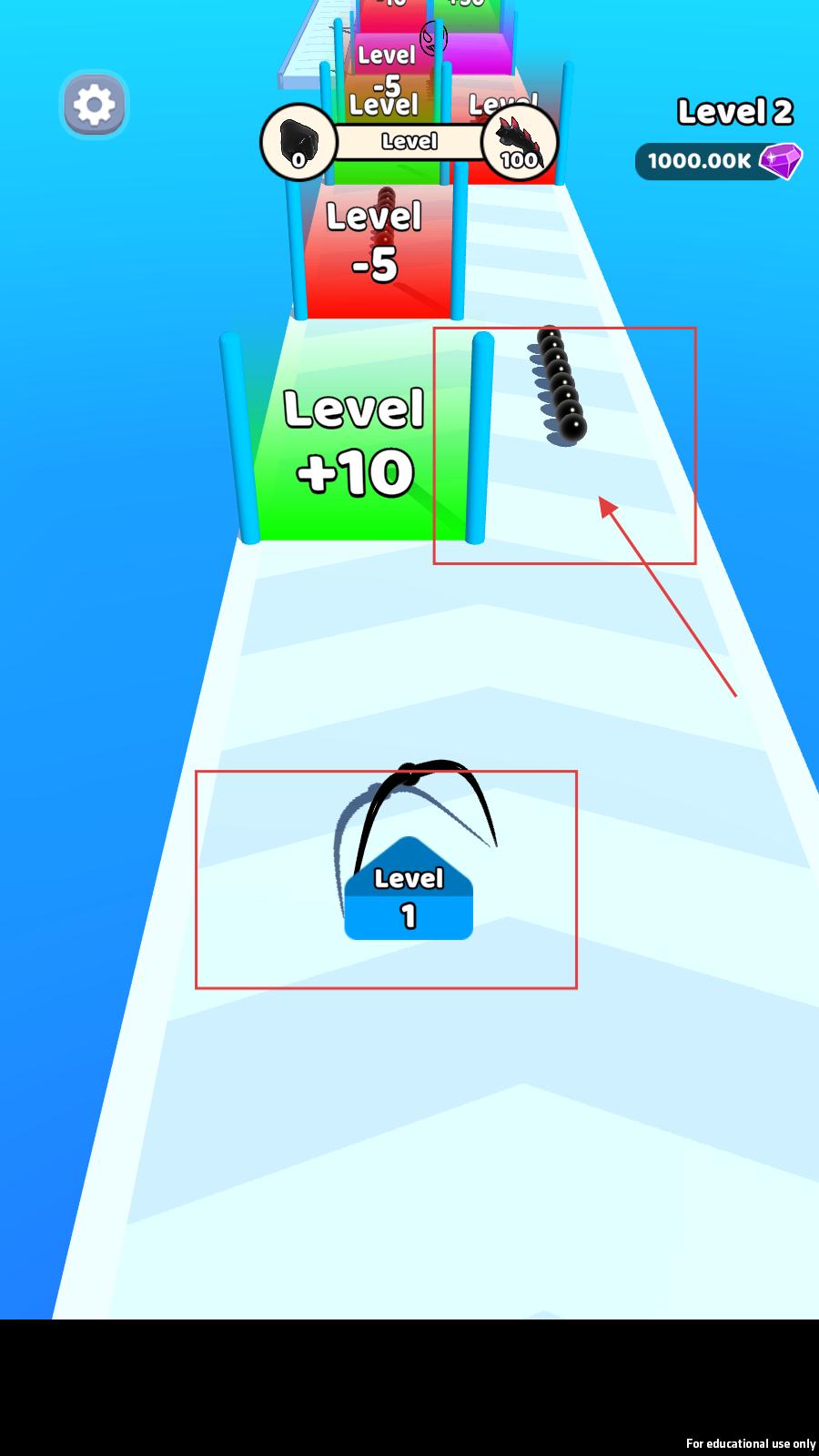 1、玩家需要操控角色在跑道上移動,優先進入綠色的增益區域,避開紅色減益區域,收集黑色球體提升等級。