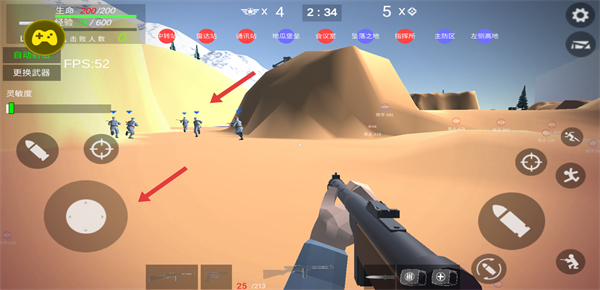 1、跟隨隊友推進利用自動射擊功能消滅敵人關注生命、經驗和擊敗人數適時更換武器參與區域爭奪。