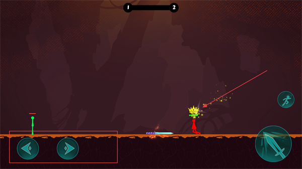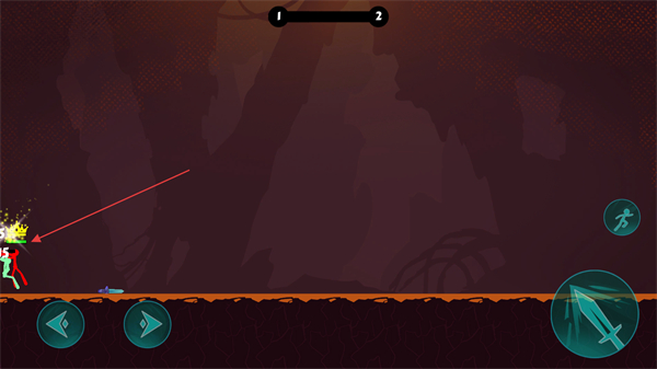 2、通過左側虛擬搖桿控制火柴人在洞穴場景中左右移動,調整與敵人的距離,躲避攻擊的同時尋找進攻時機。