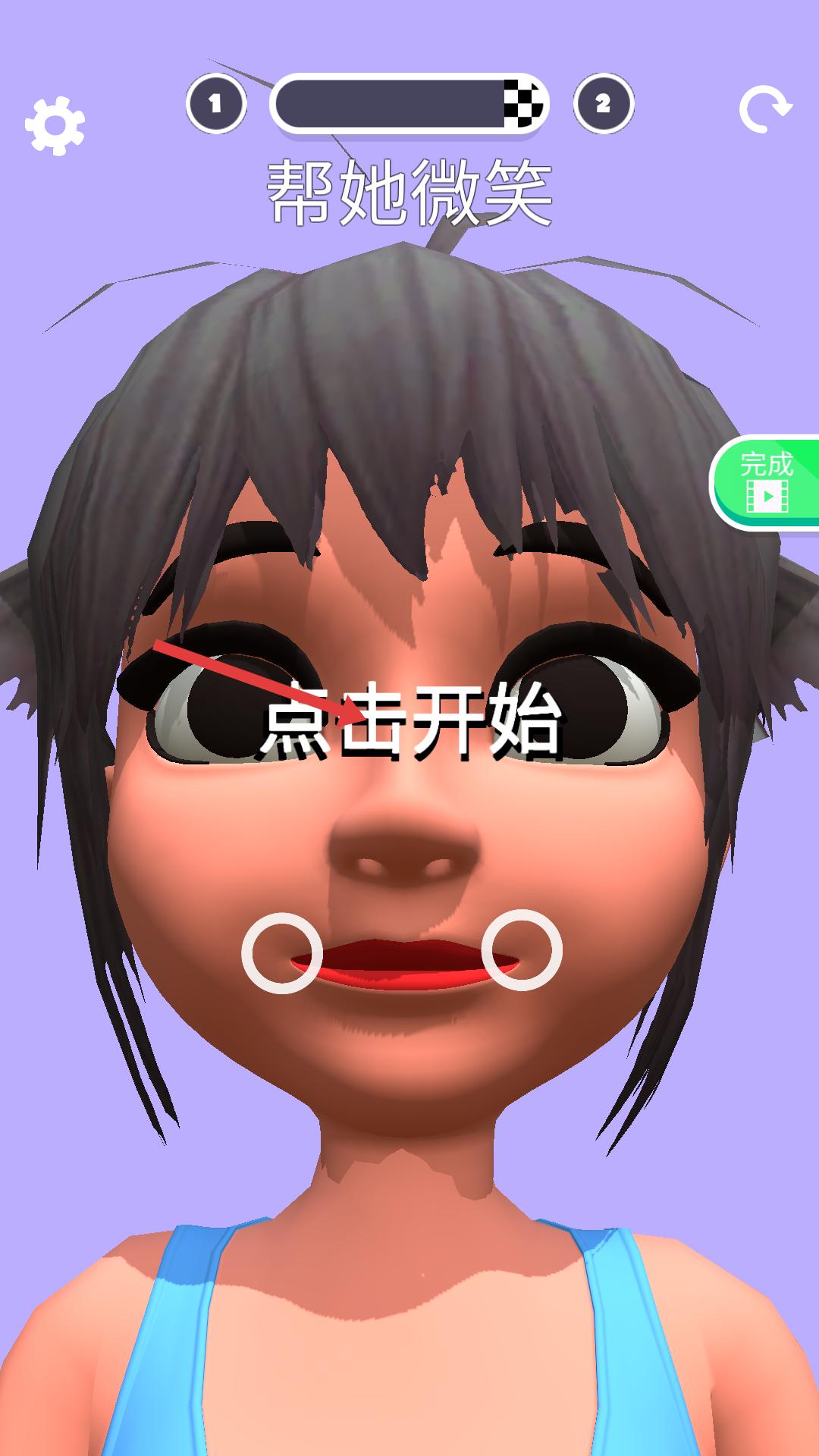 1、點擊開始,通過調整角色面部肌肉,幫她呈現微笑表情,完成面部互動任務,進行其它關卡。