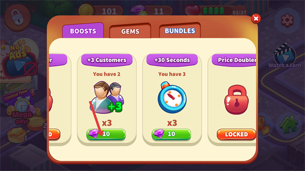 3、在道具界面消耗10鉆石購買3Customers道具,增加顧客數量,提升餐廳收益。