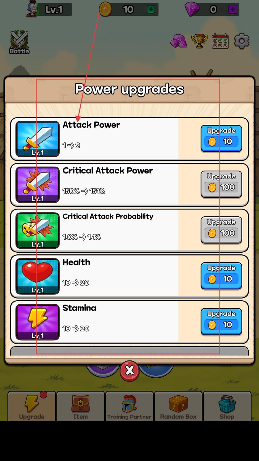 1、玩家可在力量升級界面,使用金幣升級攻擊力、生命值、耐力等屬性,提升角色戰斗能力,為后續戰斗和成長奠定基礎。