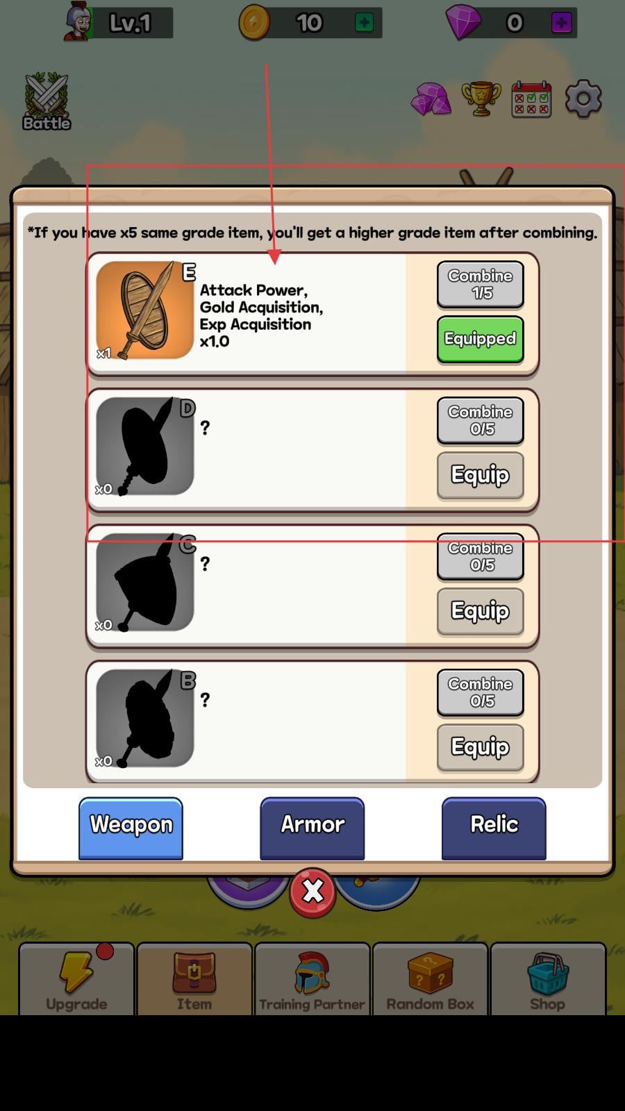 2、在物品界面,裝備E級武器可提升攻擊力、金幣獲取和經驗獲取,收集5個同等級物品可合成更高等級物品,增強角色實力。