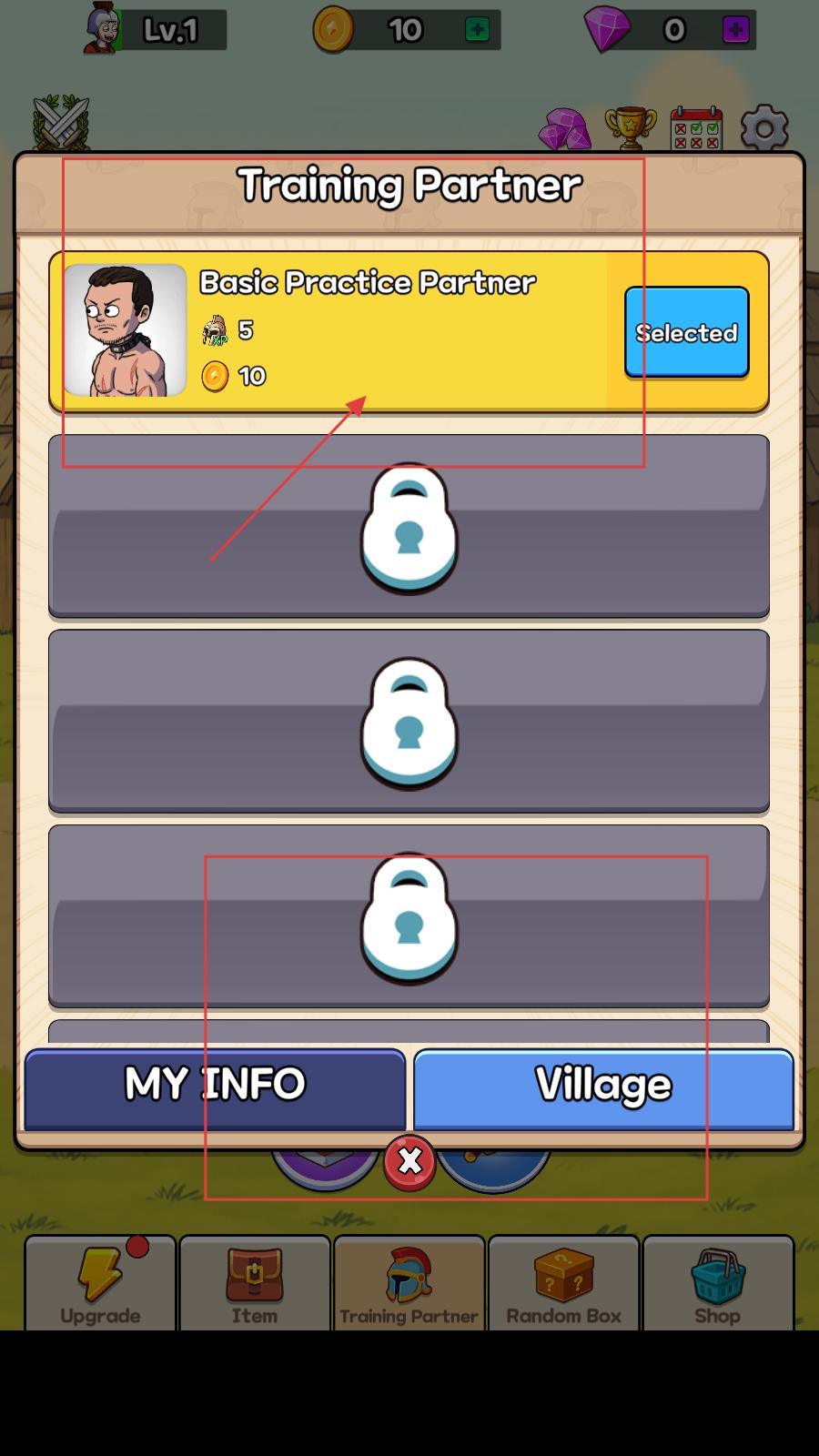 3、還可以選擇基礎練習伙伴進行訓練,消耗10金幣可獲得經驗和金幣獎勵,提升角色等級和資源積累,解鎖更多訓練伙伴。