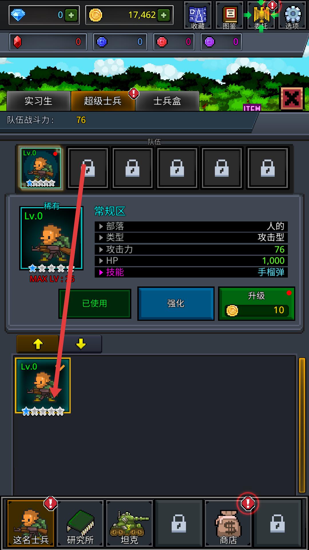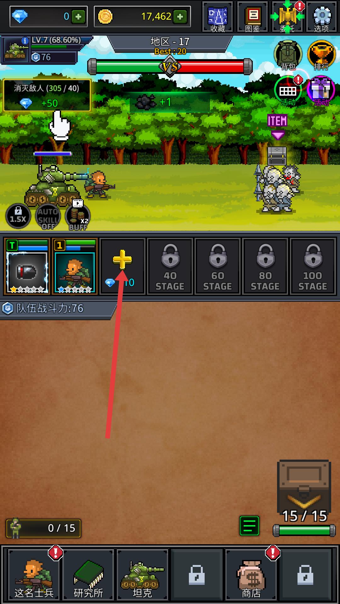 1、點擊加號,招募士兵,擴充隊伍戰力,提升戰斗能力,以便更好地消滅敵人,完成任務目標如消滅40敵人可獲50鉆石。