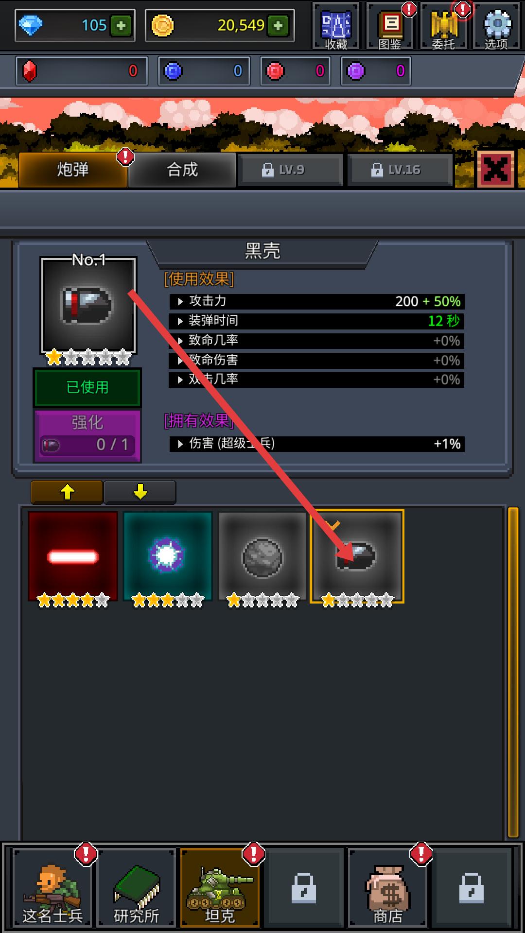 4、選擇并裝備炮彈如黑殼,其具備200攻擊力等屬性,可提升坦克的攻擊能力,有效打擊敵人,推動游戲進程。