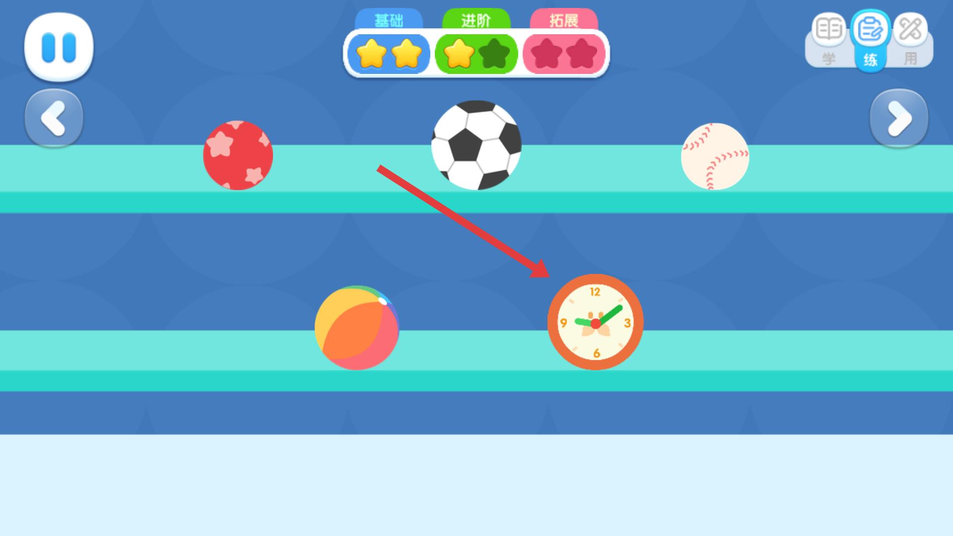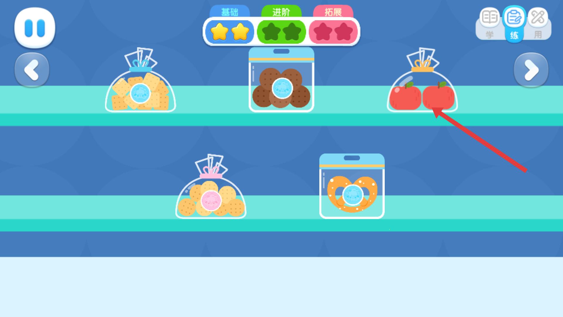 4、物品分類場景,需區分食物、球類等不同物品,正確分類可解鎖進階階段星星,挑戰更難分類任務。