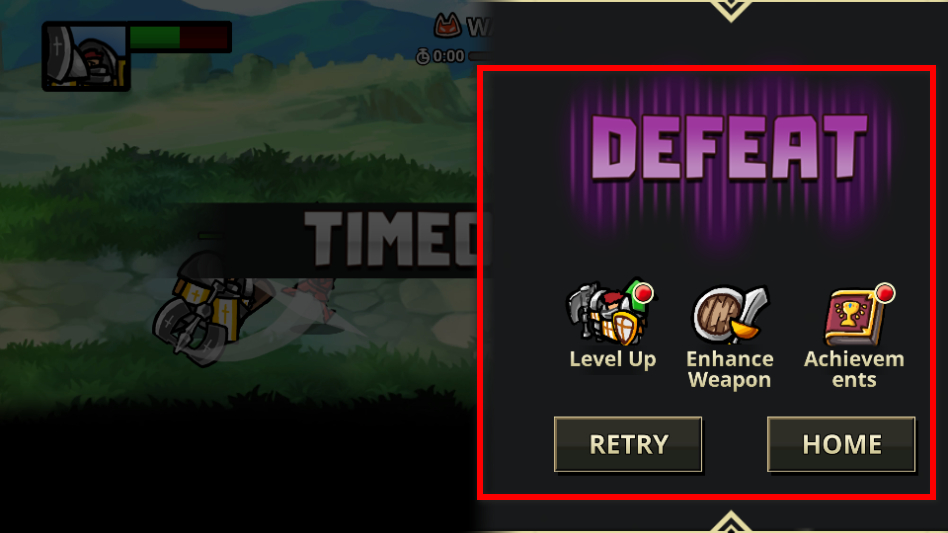 4、若戰斗失敗,可選擇RETRY重新挑戰或HOME返回主界面,返回后可升級武器、強化裝備或查看成就,提升戰力后再挑戰。