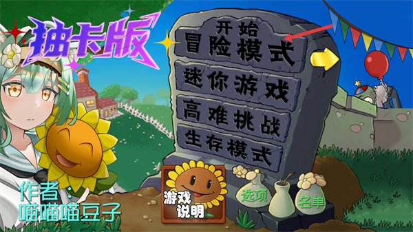 1、選擇開始冒險模式進入植物大戰僵尸抽卡版的冒險,熟悉游戲的初始界面為后續的植物種植和僵尸抵御做準備。