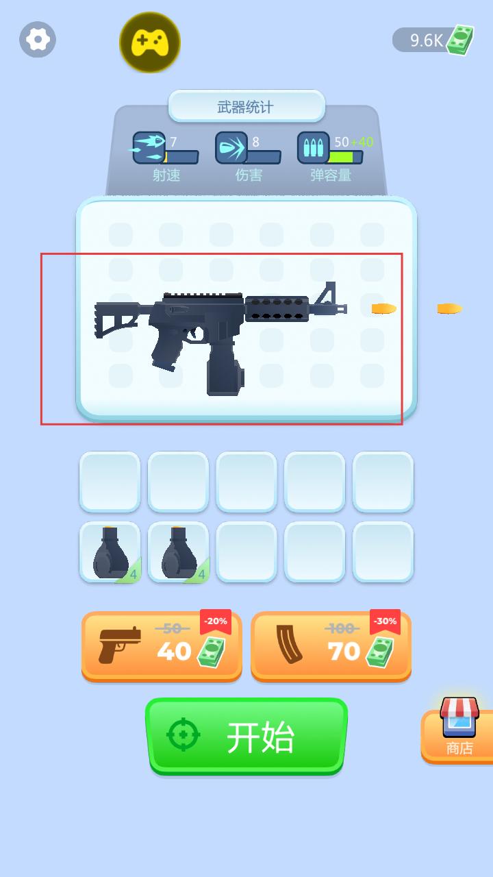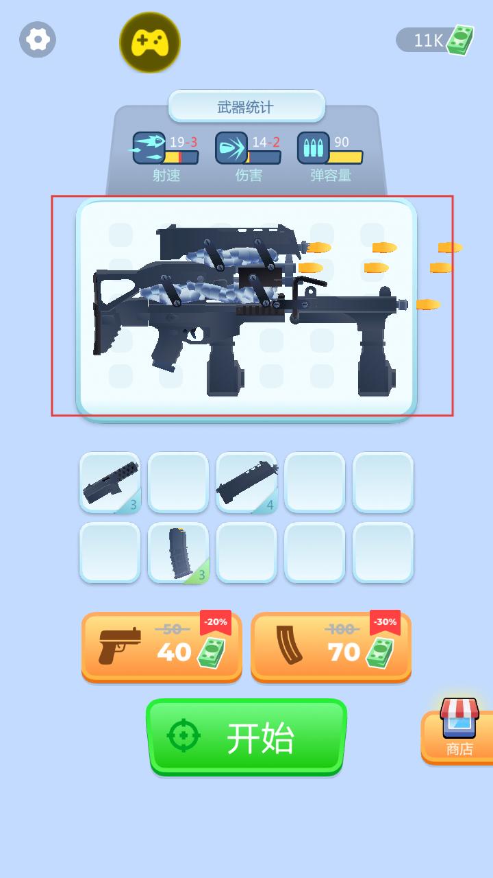 1、在武器組裝界面,可組合多種槍械部件,查看射速、傷害、彈容量等武器統計,搭配好后點擊開始,開啟射擊生存之旅。