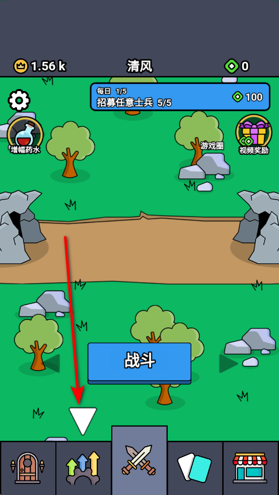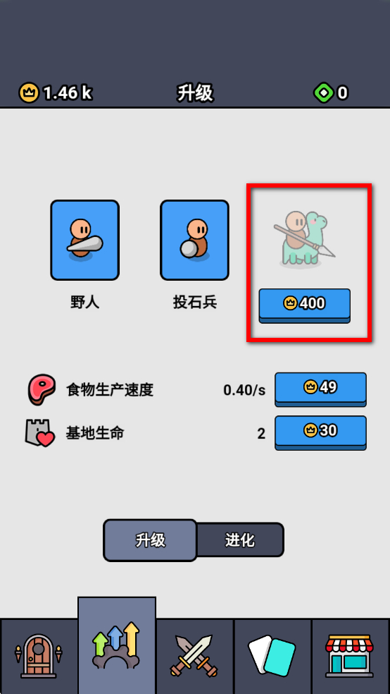 1、點擊下方箭頭進入升級界面,可對士兵、食物生產速度、基地生命等進行升級,提升整體戰力和資源獲取效率。