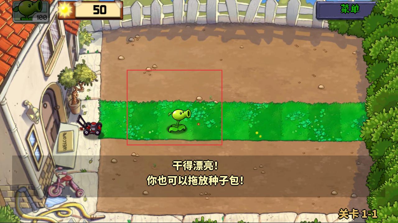 2、進入關卡1,點擊種子包將其撿起,獲取種植植物的資源,為后續布置防御陣線積累基礎。