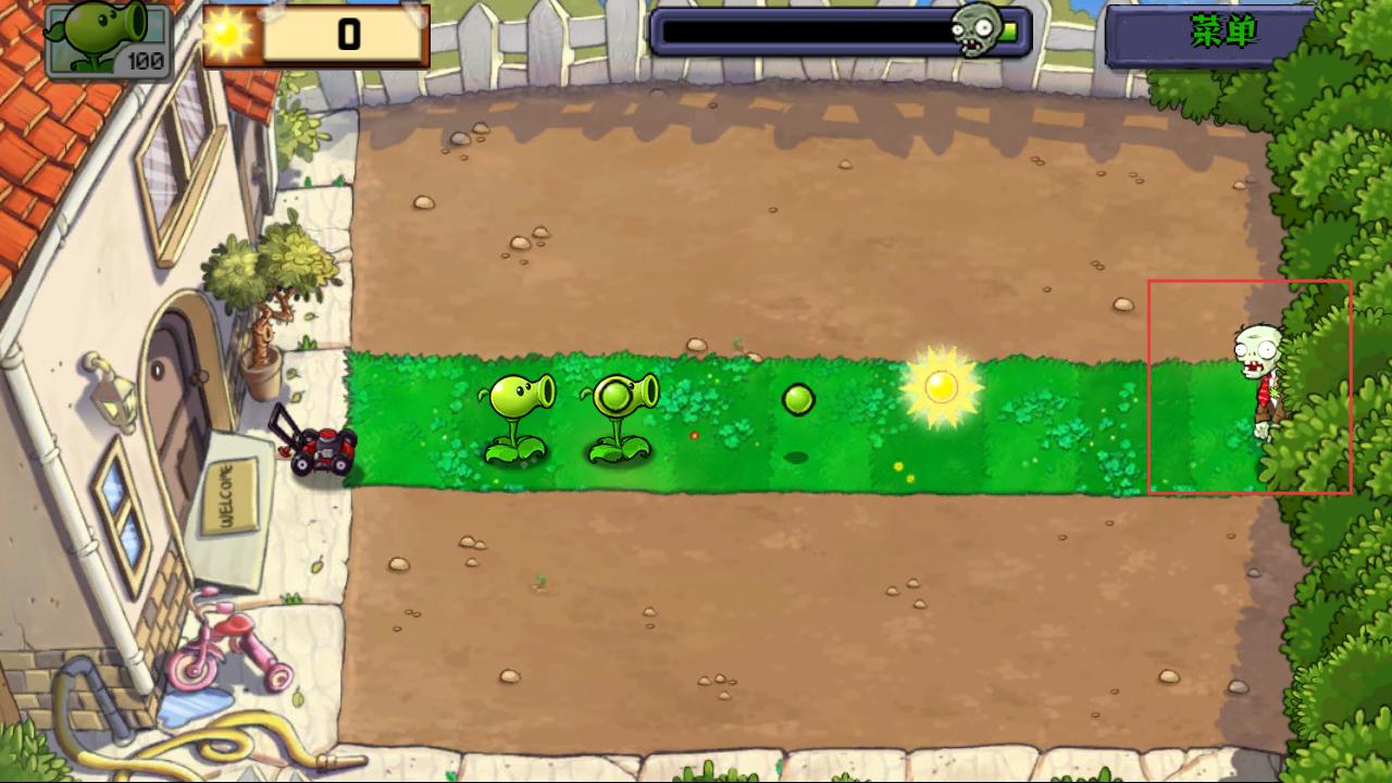 4、種植的豌豆射手發射豌豆攻擊僵尸,阻止其向房屋推進,在戰斗中不斷優化植物布置,提升抵御效果。