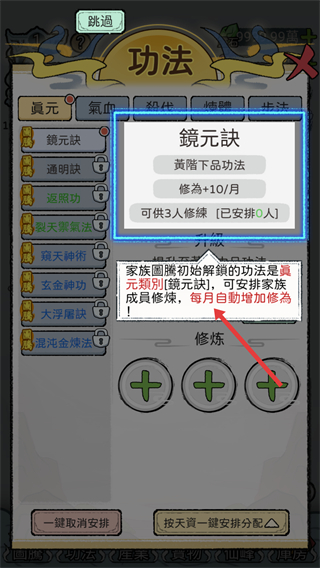 1、家族圖騰初始解鎖真元類功法鏡元訣可安排家族成員修煉每月自動增加修為,提升家族成員的修煉進度增強家族實力。