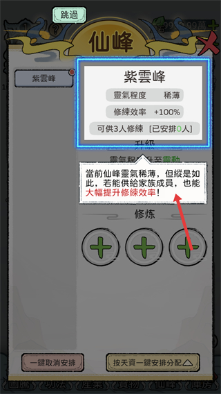 2、仙峰紫雲峰靈氣稀薄但能大幅提升修煉效率,安排家族成員在仙峰修煉利用修煉效率加成加快成員的修煉進程。