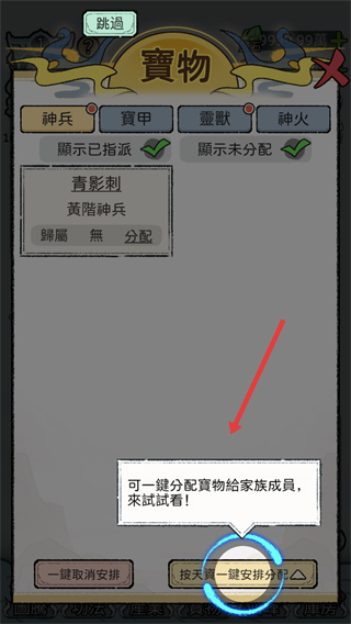 4、可一鍵分配寶物給家族成員合理分配神兵、寶甲、靈獸、神火等寶物提升家族成員的戰力增強家族的整體實力。