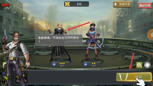 2、選擇英雄組成隊伍點擊戰斗按鈕進入戰斗,利用英雄的技能和屬性消滅敵人推進關卡進程。