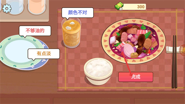 4、菜肴制作完成后點擊完成,根據評價如顏色、油度、味道調整后續烹飪策略,不斷提升烹飪技藝,獲取更多金幣和獎勵。