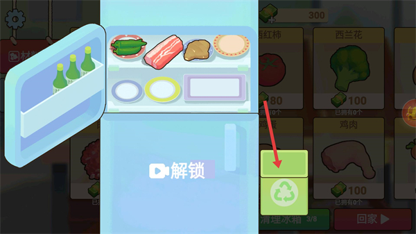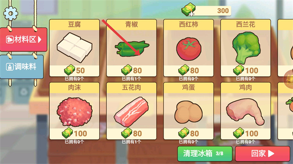 3、在材料區選購食材如青椒、五花肉等,消耗金幣解鎖食材,為烹飪準備原料。
